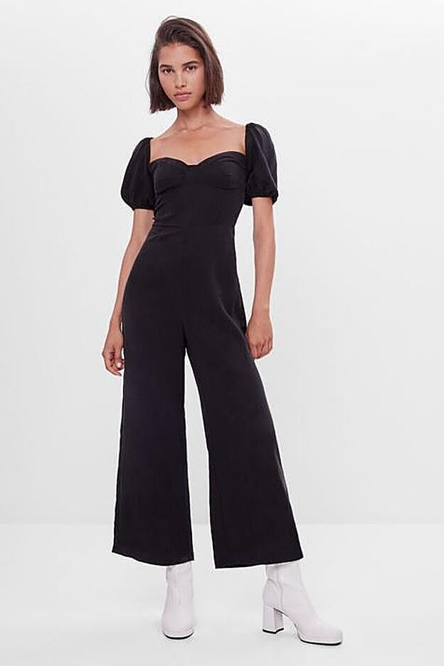 El primero y más ponible durante los próximos meses es este mono de lyocell sostenible con mangas cortas abullonadas, perneras anchas y escote corazón. De 29,99 euros ha pasado a costar 17,99 euros y está disponible entre las tallas XS y L.