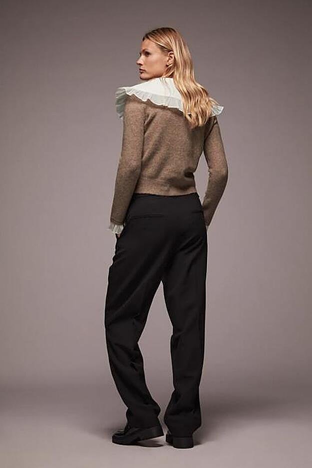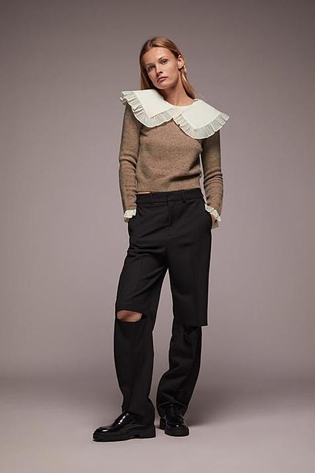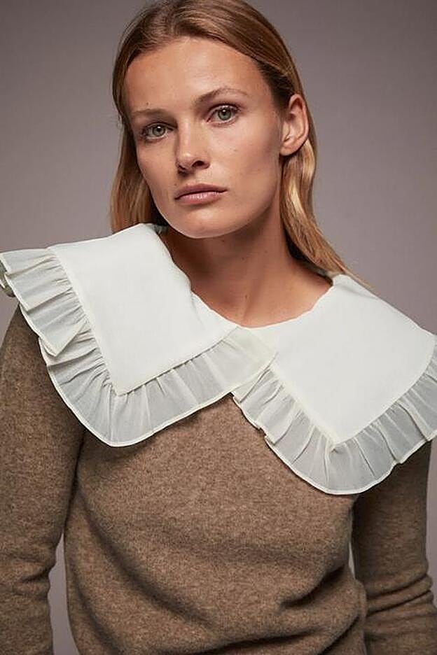 En la firma de Inditex para esta innovación han apostado por un jersey marrón con mangas largas y diseño cropped. A la prenda le han añadido tejido combinado en tonos beige y mientras que en los puños le dan un toque muy elegante con la confección de volantes, en el cuello han apostado por la versión XXL del cuello bobo.