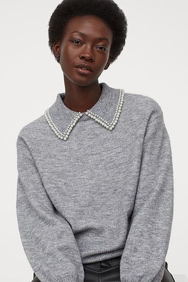 Por su parte, la firma sueca se ha decantado por el gris jaspeado para este jersey en punto suave con lana en la trama. Con los hombros ligeramente caídos y mangas amplias con remate de canalé en puños y bajo, este jersey tiene el cuello de canalé ribeteado con cuentas. Un diseño en el que los detalles son los encargados de convertir esta prenda en una creación diferente y atractiva.
