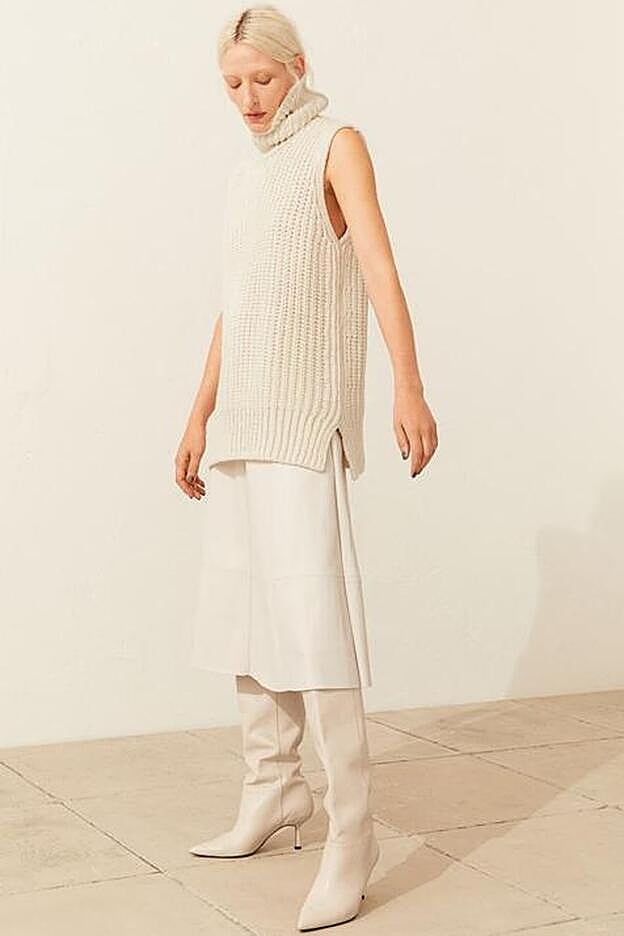 Por último, en color crema, encontramos este suéter sin mangas en punto de canalé suave con lana en la trama que pertenece a la colección sostenible de la firma porque está confeccionado en poliéster reciclado.