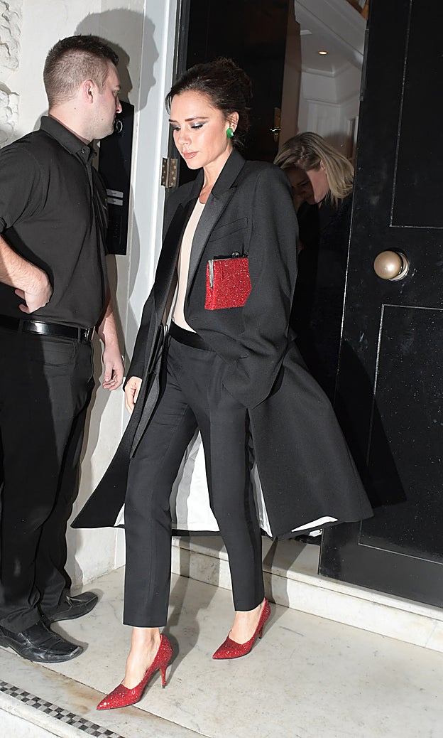 Pensando como estamos ya en los próximos eventos que nos traerá la Navidad, hemos visto en el último look de Victoria Beckham el ejemplo más sencillo e inspirador para crear nuestros estilismos de fiesta. Y es que para acudir, precisamente, a un evento navideño en Londres, la diseñadora ha apostado por lucir un 'total look' firmado por ella (como casi siempre) en el que ha combinado un esmoquin de su colección Limited Edition con complementos 'glitter' en rojo de su línea Dorothy de accesorios.
