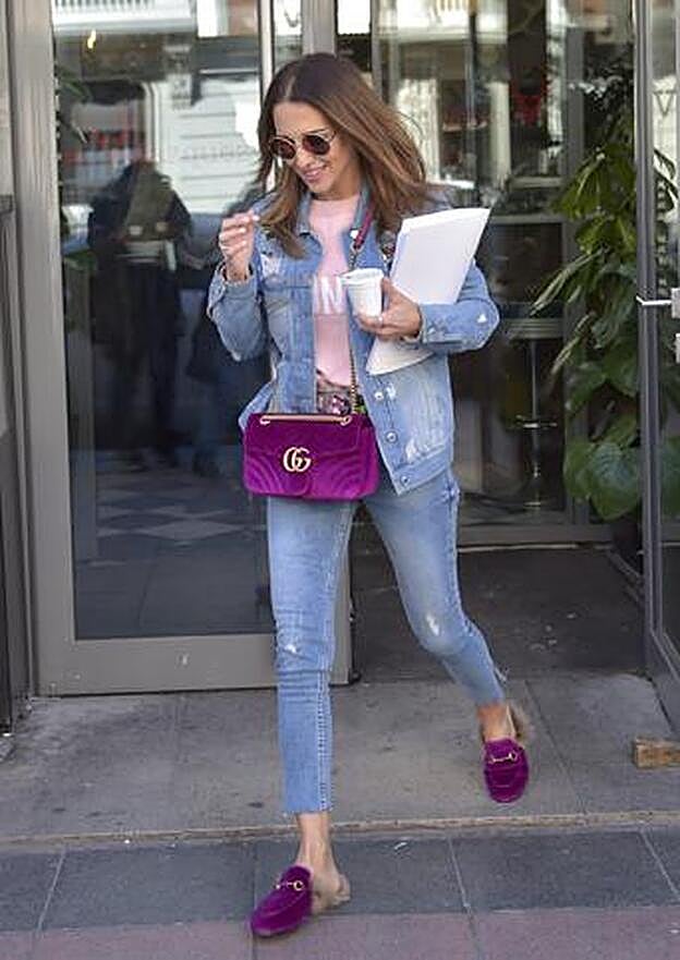Eso sí, la clave del look 'influencer' de Paula Echevarría estaba, sin duda, en los complementos. La actriz volvió a apostar por Gucci y puso la nota de color (del año) 'ultraviolet' con el GG Marmont en terciopelo y los 'slippers' Princetown con su característico 'pelito' a juego, además de un original cinturón de la firma italiana. Las gafas redondas le daban el punto Gigi/Bella Hadid.