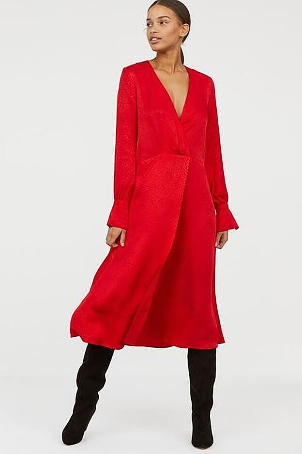 Confeccionado en un jacquard rojo muy elegante, con silueta holgada (para que no nos incomode después de las 'comilonas'), sugerente escote en uve y ese largo midi que ha conseguido que nos olvidemos de los extremos (esta temporada se ha confirmado que ya no se llevan las faldas ni muy cortas, ni extra largas), este vestido de H&M promete ser la estrella de nuestros looks de Navidad.