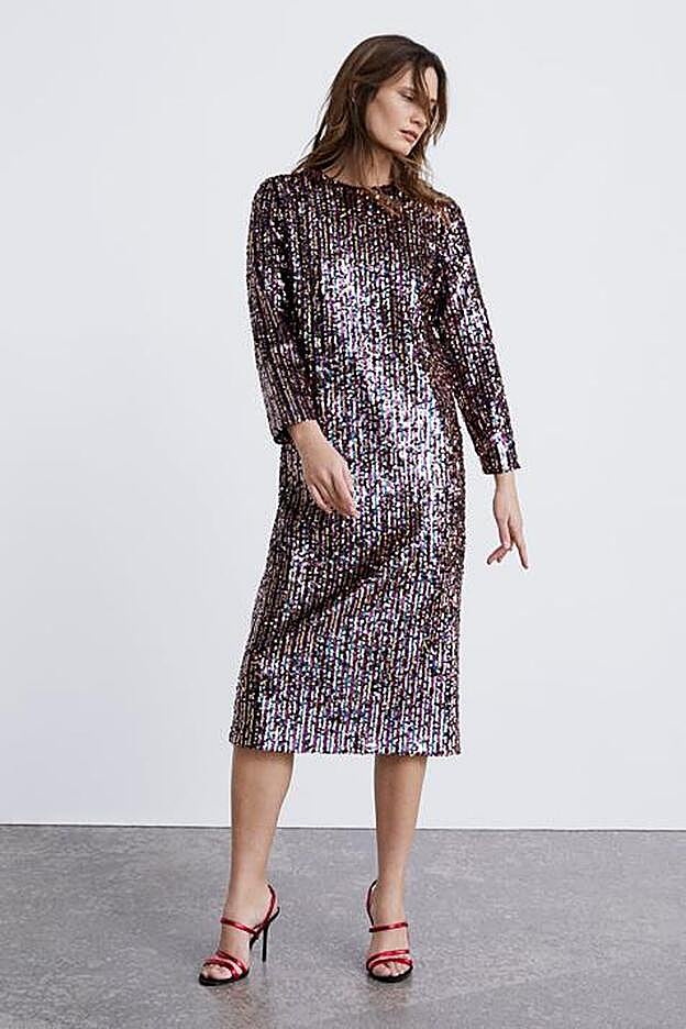 Con las lentejuelas como protagonistas creando un estampado de rayas multicolor, el nuevo vestido de Zara tiene un favorecedor largo midi y escote redondo, y con su efecto joya es perfecto para brillar sin necesidad de más complemento y ya se antoja como uno de los próximos éxitos virales de la firma en Navidad y Nochevieja.