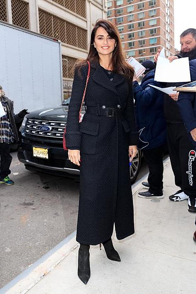 Prueba de ello es este look de Penélope Cruz que combina abrigo largo hasta los pies en color negro, un bolso rojo de Chanel, y unas botas mosqueteras de antelina con terminación en punta y un buen tacón también en negro.