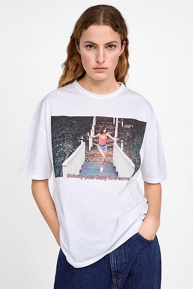 La primera de ellas que ha llamado nuestra atención ha sido esta camiseta blanca de algodón, con una de esas escenas que hemos reproducido mil veces cuando nadie nos miraba, el baile de Baby sobre el puente. Y, para qué queremos más, lleva escrita una de las frases estrella del guión de la película: "Baby, no dejaré que nadie te arrincone". La frase que nos hizo derretirnos del todo con el protagonista masculino, Johnny, interpretado por Patrick Swayze. Pero el frontal no es lo único que nos gusta de la camiseta, a la espalda esconde una sorpresa...