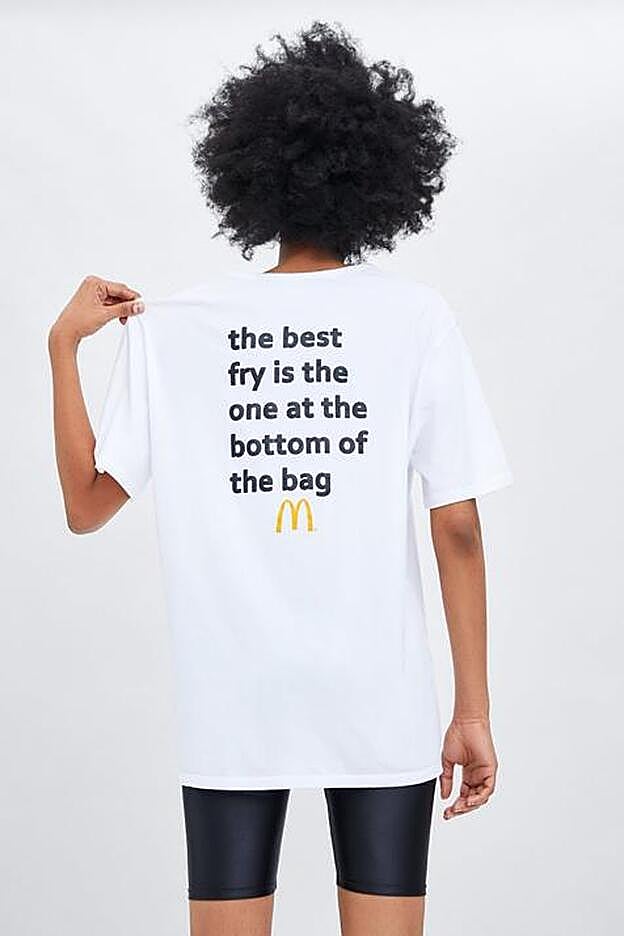 La camiseta (15.95 euros) tiene estampada en la parte delantera la la inconfundible caja roja de patatas con el logo en amarillo; mientras que en la parte posterior se lee: "la mejor patata es la que queda en el fondo de la bolsa". Sí, esa misma patata por la que eres capaz de batirte en duelo con quien sea si se le ocurre robártela...