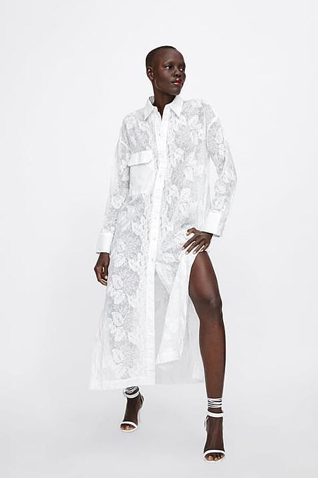De silueta holgada, estilo camisero, favorecedor largo midi con aberturas, bolsillo delantero de plastrón con solapa en el pecho ey confeccionado en impoluto algodón blanco adornado con bordados combinados a tono, este vestido túnica de la nueva colección de Zara ya se ha convertido en nuestro favorito indiscutible para la primavera-verano.