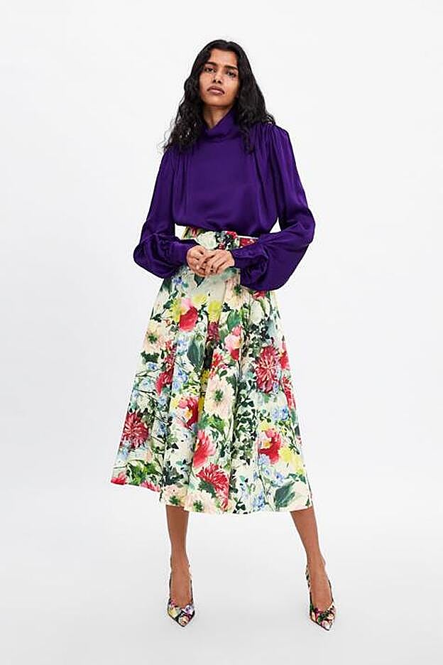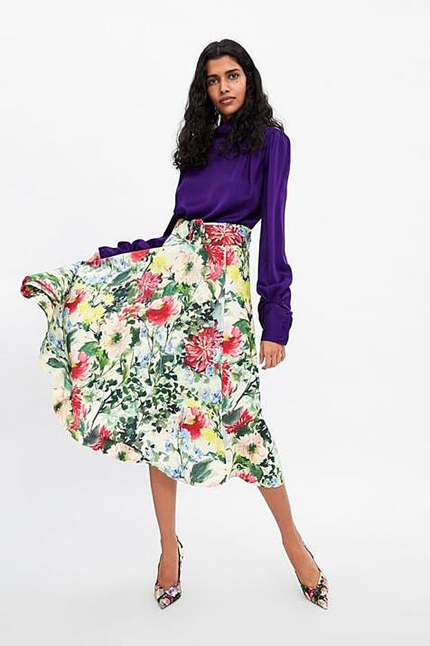 Las flores siempre han sido el estampado estrella de la primavera, y aunque esta temporada los lunares vienen pisando fuerte, el clásico 'print' da color a través de una perfecta unión de rosas, verdes y amarillos a un vestido y una falda de Zara que, bien combinados, serán una opción ideal para un look de invitada 'low cost' de día con muchísimo estilo.