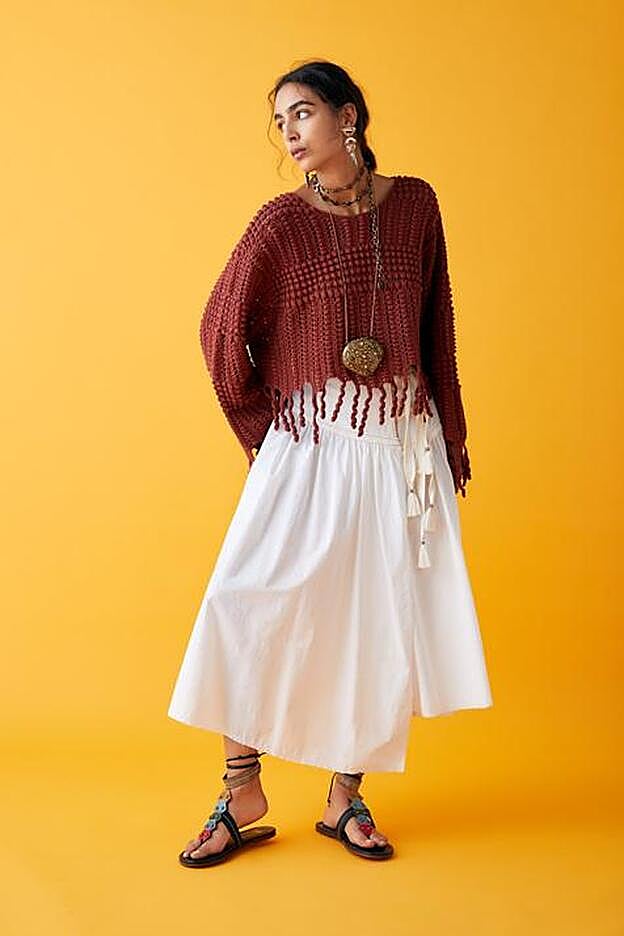 Se trata de un original maxi collar rematado con un pequeño bolsito metálico con detalle de piedras e interior forrado que, además, se puede llevar como mini-cartera con la cadena colgada al hombro. Un 2x1 que subirá muchos puntos tu look de primavera de inspiración 'boho' por 19.95 euros...