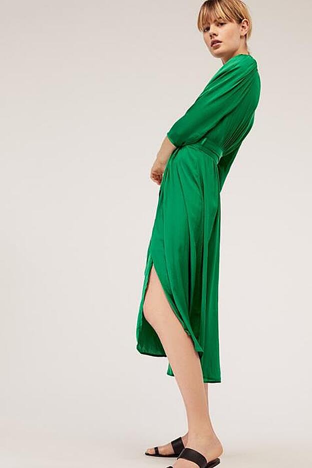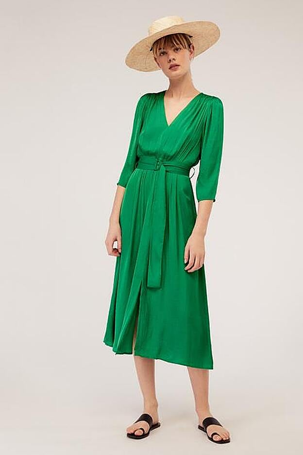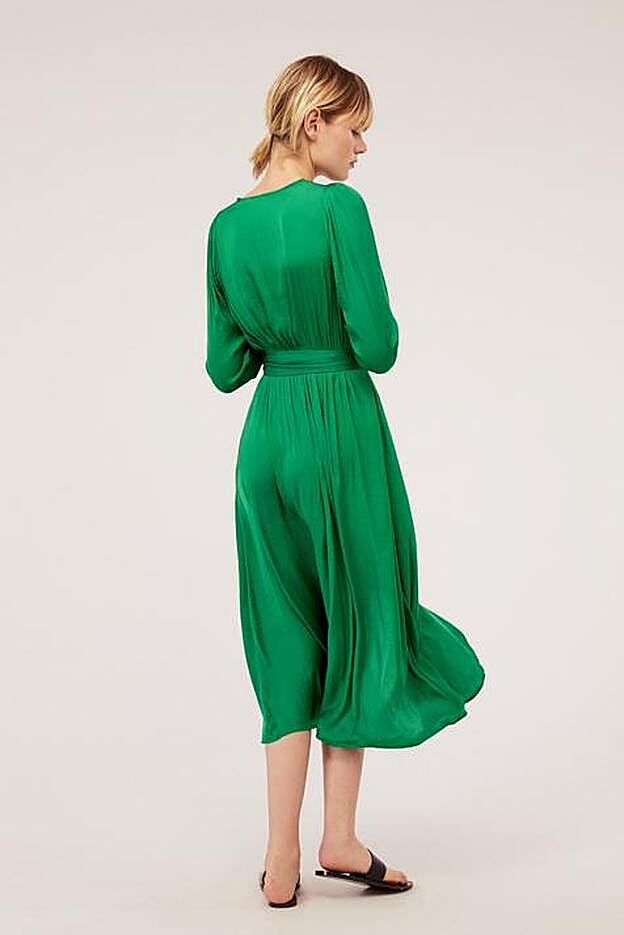 De largo midi, lo que lo convierte en una opción perfecta para una ceremonia de día, en un favorecedor verde hierba y confeccionado en delicado satén, este vestido de Oysho (35.99 euros) nos parece ideal para combinar con un pamelón y unos complementos potentes en un color que contraste (del amarillo al azulón) o en acabado metalizado.