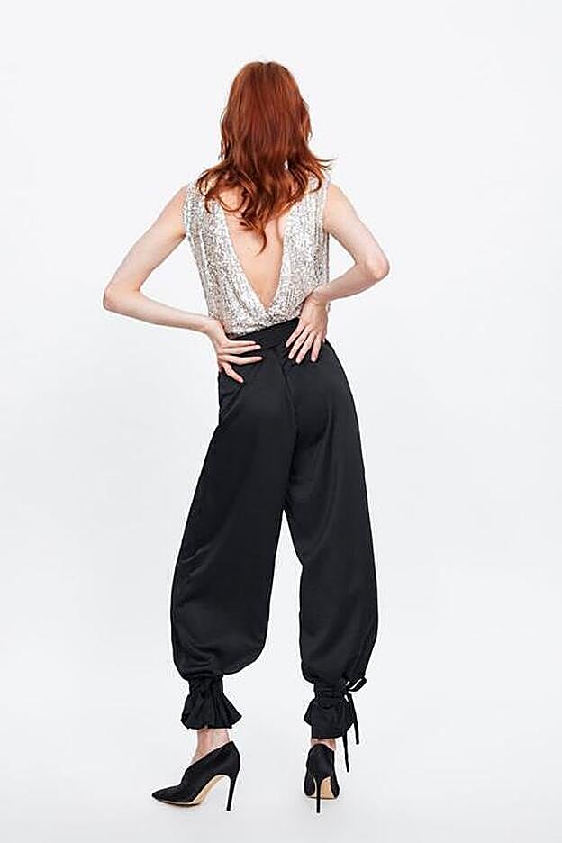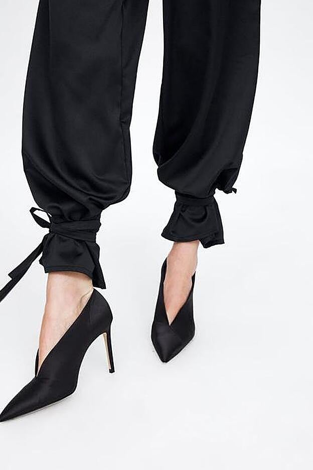 Se tratan de unos pantalones bombachos, en color negro satinado, de tiro alto, y con un bajo que te enamorará. Resulta que el gigante de Inditex decidió colocarle al bajo unos lazos. La lazada puede ajustarse al largo que prefieras, por lo que los puedes poner a la altura de lo tobillos o más arriba. Este pequeño detalle convierte al pantalón en una prenda súper versátil y por lo tanto apta para llevar con taconazos, sandalias de tiras finas o zapatillas.