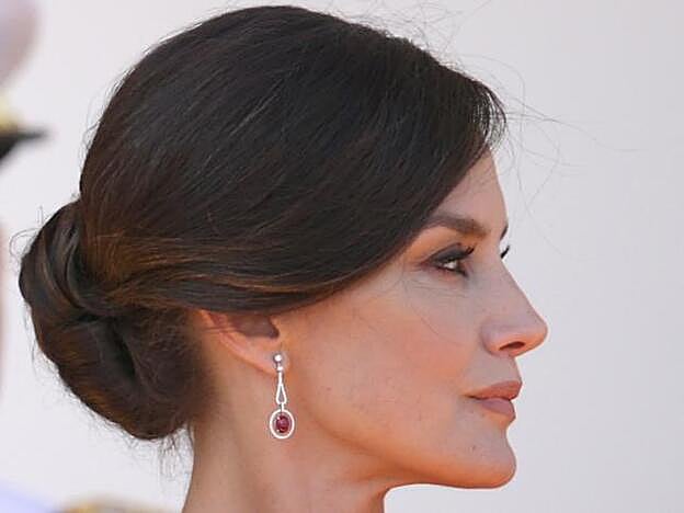 Para completar el look, la Reina Letizia acompañó al vestido con unos zapatos de tacón ancho firmados por Felipe Varela, un bolso de mano tipo sobre en el mismo tono y recogió su pelo en un moño bajo. Como complementos solo llevó unos pendientes plateados a juego con el resto del look.