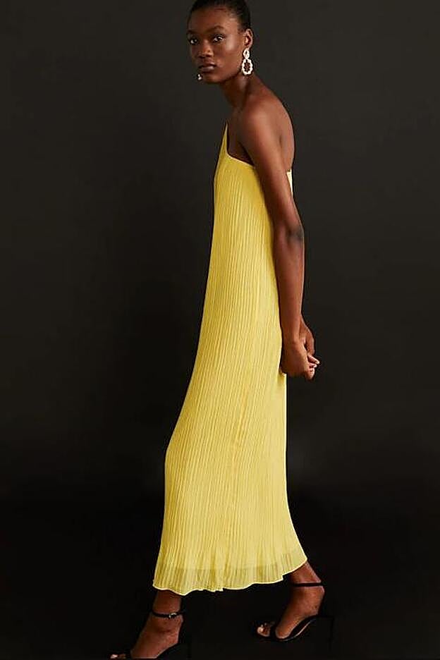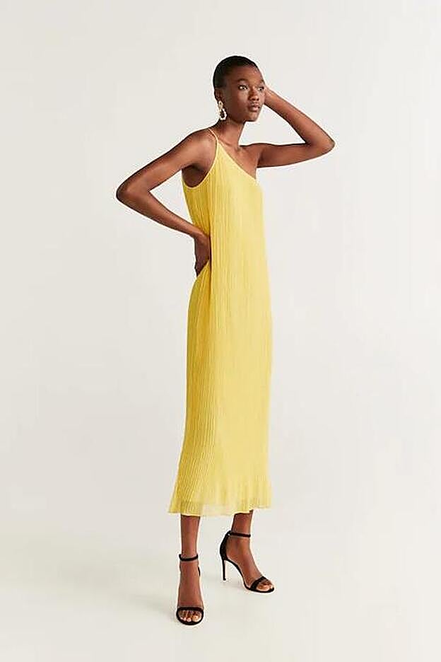 En un favorecedor amarillo que nos ayudará a potenciar nuestro bronceado, con una silueta recta que disimula cualquier kilo de más que hayamos ganado en el chiringuito, con un largo tobillero que lo hace perfecto tanto para eventos de día como de noche, y con un sofisticado y sensual escote asimétrico, este vestido plisado de Mango nos parece la mejor opción para nuestros próximos looks de invitada perfecta... ¡y low cost!