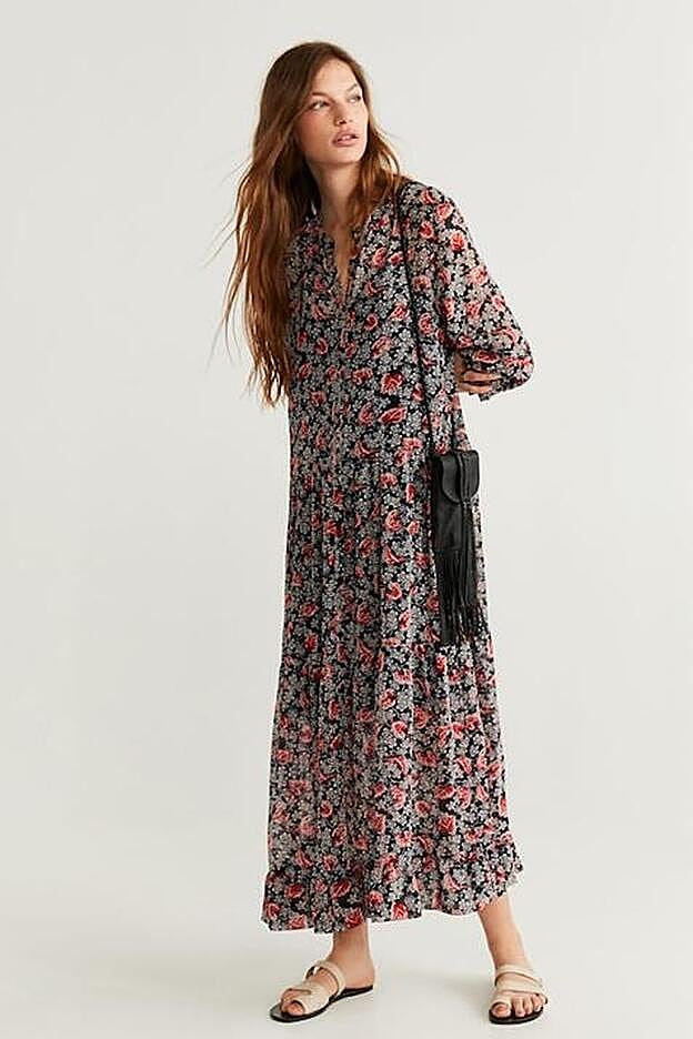 No nos queremos olvidar de este vestido, también con estampado floral, de Mango. No tiene tantísmo vuelo como los anteriores, pero sí ua silueta fluida y generosa que busca ese efecto de amplitud y ligereza que caracteriza a este tipo de vestidos. Lleva la consabida manga larga, el escote en pico y un cierre oculto con botones. Cuesta 49,99 euros.
