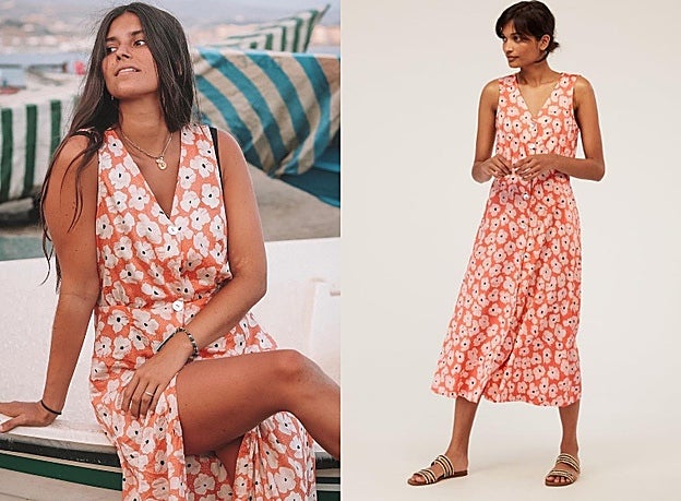 Creemos que llegamos tarde, porque la pieza no está disponible en la web española de la marca de Inditex. Confeccionado en tallas S, M y L, ahora solo puede adquirirse en algunas de ellas pero en webs extranjeras, así que quizá todavía puedas hacerte con él, aunque el envío sea otro asunto... Se trata de un diseño abotonado en color naranja pastel con flores blancas que nos ha robado el corazón. Se vendía por 35,95 euros y en rebajas se ha llegado a ver por 15,99 euros. ¡Una rebaja más que considerable!