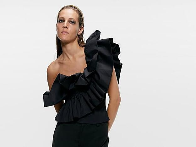Se trata de un top negro, asimétrico, con dos volantes en la parte superior, pero ajustado en el tronco. El sueño de cualquier amante de lo 'extra' y el estilismo perfecto para salir de fiesta con tus amigas.