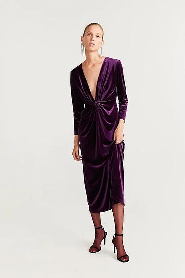 Ni el vestido de nuestros sueños que compartió Sandra Majada, ni el de lunares que disimula las curvas de Nuria Roca, el vestido de invitada más ideal de la temporada se encuentra en Mango. Se trata de un vestido midi de terciopelo de diseño recto. Es morado (color tendencia), de manga larga, tiene el escote en pico y se caracteriza por un nudo en el final del escote. Pero sin duda, lo mejor es su precio. Tan solo cuesta 39,95 euros.