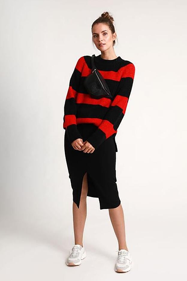 En Stradivarius podemos encontrar la versión más elegante, el jersey de canalé de rayas rojas y negras, por 15,99 euros. Es una opción excelente para combinar con unos pitillo negros y unas botas rojas. Y nos encanta porque la primera raya roja queda "mordida" gracias a su vistoso cuello Perkins.