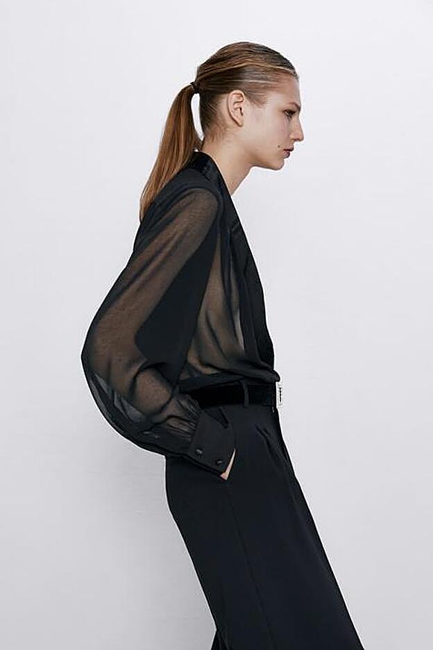El body tiene un escote pico cruzado muy, pero muy pronunciado, además es trasparente y de manga larga. Para hacerlo aún más bonito Zara ha confeccionado su solapa con lo que ellos llaman "tejido combinado", y nos encanta.