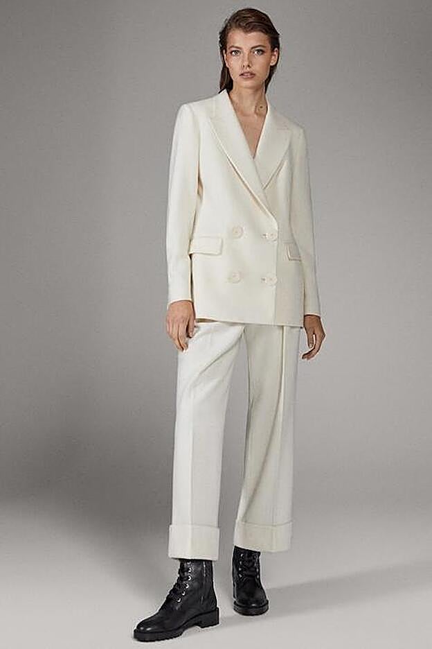 El traje es de Massimo Dutti y está formado por una blazer confeccionada en tejido 100% lana, con corte slim y cierre de doble botonadura. Está rebajada a 129 euros y tiene su pantalón a juego. Un modelo de corte recto que ahora cuesta 39,95 euros. Carla combinó este dos piezas con un chaleco también blanco, joyas llamativas y un sombrero negro. Un outfit de inspiración flamenca que tu puedes adaptar de muchas formas. Con un top y unas sandalias de tacón para la noche, con sneakers y camisetas para el día a día y... ¿por qué no? Como look para pasar por el altar.