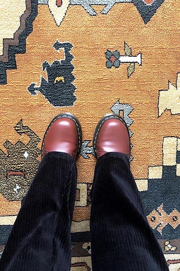 La periodista los ha combinado con un jersey de punto fino en tono blanco, unas botas en tono granate de Dr. Martens y su complemento estrella, el sombrero en color beige.