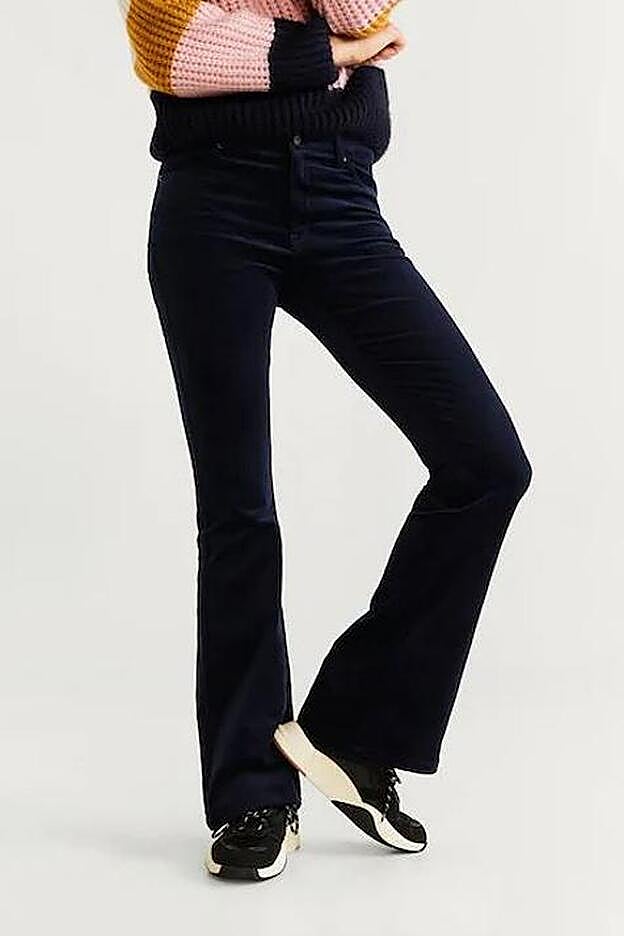-Pantalón acampanado tipo flare con cierre de cremallera y botón en tono azul marino. ¿Dónde? En Mango. ¿Cuánto? Antes 29,99 euros. Ahora 19,99 euros.