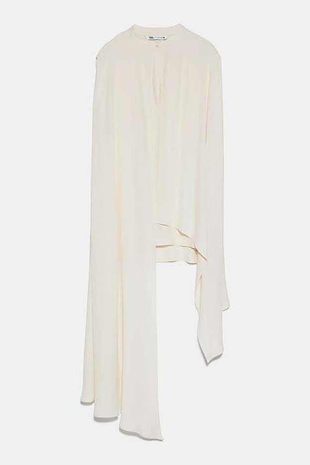 - Blusa asimétrica en color crema. Tejido semitransparente cuello redondo y manga sisa. Bajo asimétrico y lazada en la cintura. Cierre delantero con abertura y botón. Precio: 49,95 euros. Disponible de la talla XS a la XL.