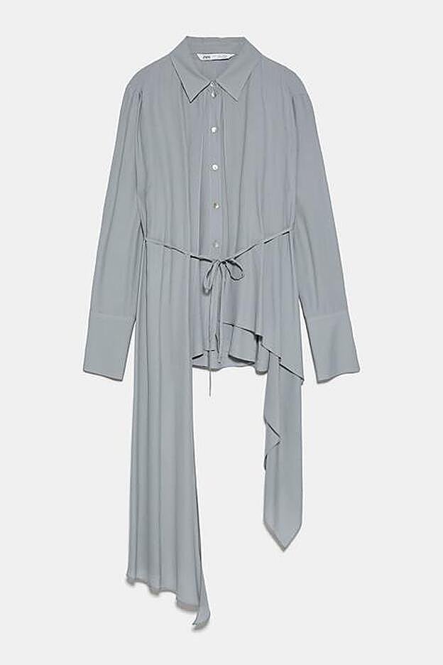 - Camisa asimétrica fluida en tono gris de cuello solapa, manga larga y puño acabado con botón. Detalle de bajo asimétrico y lazada. Precio: 49,95 euros. Disponible de la talla XS a la XL.