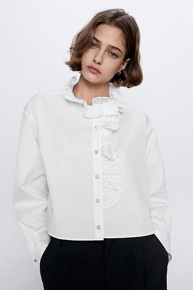 Se trata de una camisa con cuello de arlequín. Un diseño perfecto para combinar con blazers como ha hecho Tamara, o para vestir debajo de un jersey y usarla así como complemento diferenciador. Y sí, Zara tiene la versión low cost. El gigante de Inditex tiene entre todas sus camisa blancas una con el cuello con volantes muy similar a la que ha usado la influencer que cuesta 29,95 euros. Además, este modelo de Zara tiene un volante en el pecho y botones joya. ¡Es ideal!
