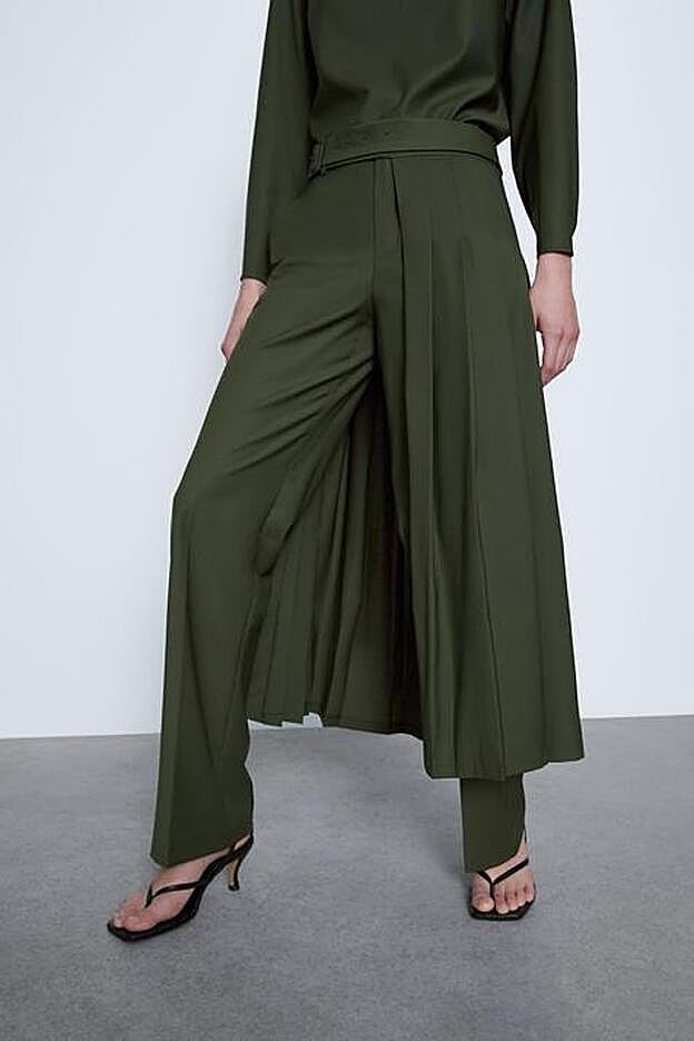 Disponible entre las tallas XS y XL, el pantalón falda plisada caqui de Zara cuesta 69,95 euros y la firma ha lanzado ha juego un precioso cuerpo drapeado en el mismo color con cuello subido fluido y manga larga.
