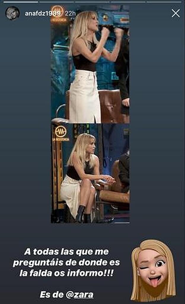 La actriz eligió este look para acudir a 'La Resistencia' y fue ella misma quien desveló de dónde era la falda ante las preguntas de sus seguidores.