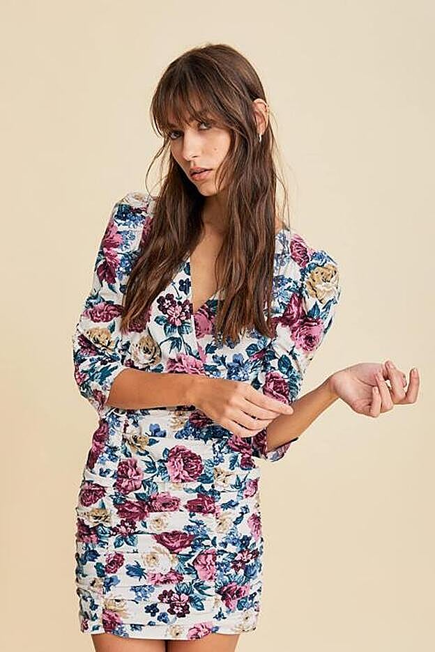 Un vestido beige con flores difuminadas en tonos verdes y malvas que cuesta 39,99 euros y que también puedes comprar en color lila y flores más pequeñas. El corte de la prenda es de esos que gustan mucho porque sienta genial gracias al drapeado de la falda que disimula las curvas y el volumen de los hombros que arma la figura. Es entallado y tiene el cuello elevado, lo que consigue un efecto estilizador perfecto.
