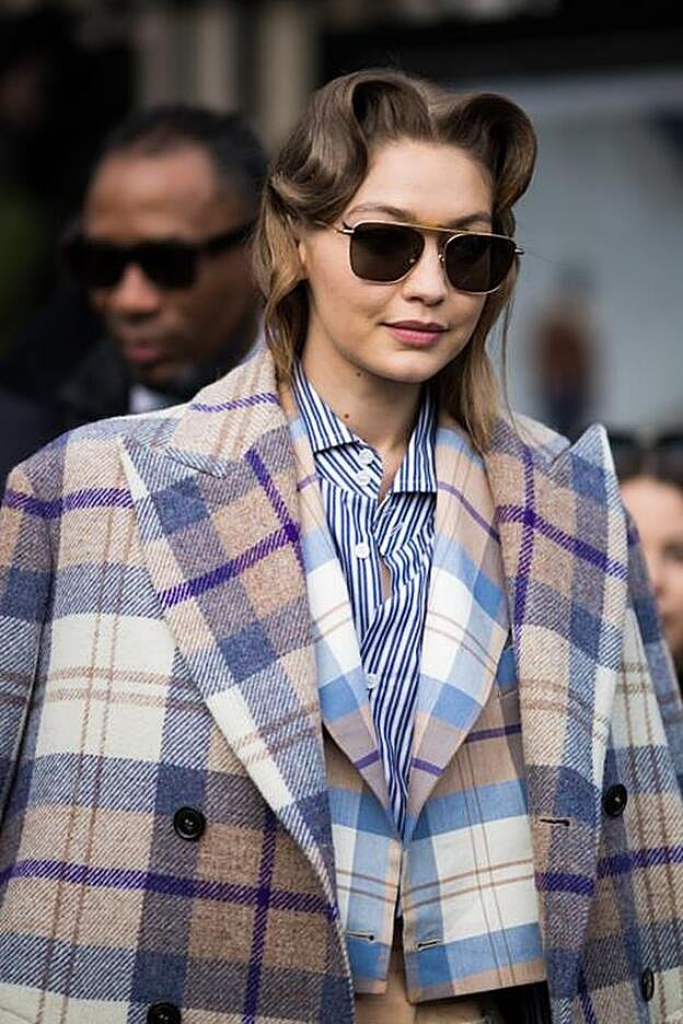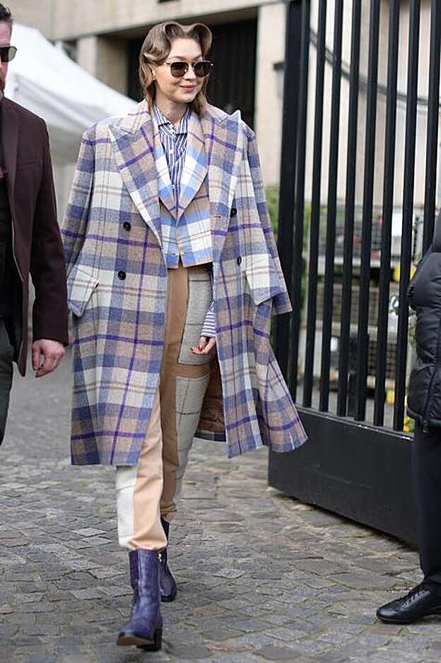 La prenda, que iba en perfecta sintonía con la blazer cropped de tonos parecidos y también de cuadros que llevaba debajo, contrastaba con la camisa de rayas. Gigi Hadid escogió un modelo azul y blanco que continuaba con la gama cromática del look y que completaba un estilismo tan arriesgado como perfecto, al que añadió unos pantalones cargo en color beige y unos botines de tacón morados.