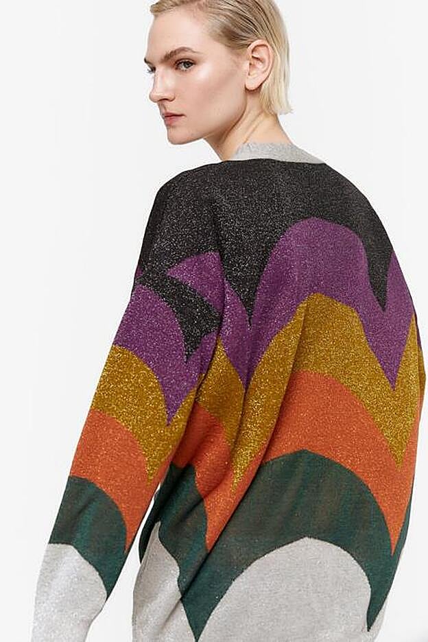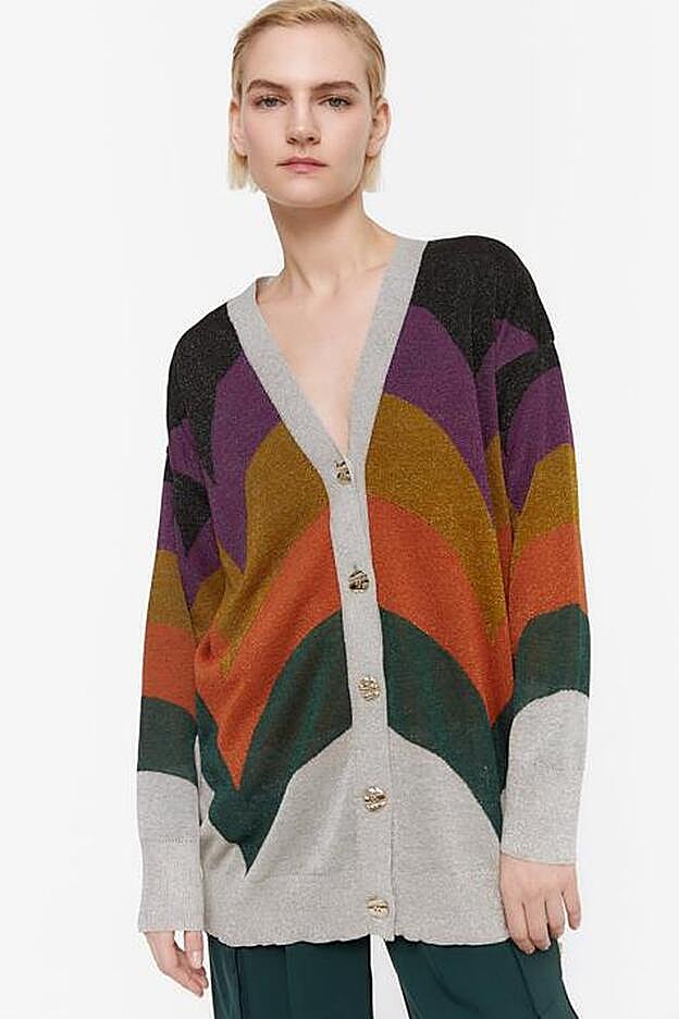 Hasta ahora, todos los estilismos que habíamos visto hasta ahora con chaquetas de punto eran para el día. Sin embargo, la influencer ha demostrado que existen modelos aptos para la noche y lo ha hecho con uno que ha encontrado en Uterqüe y que queremos ya en nuestro armario. Se trata de un cárdigan largo jacquard de colores, con escote en pico y fabricado en punto brillante. Además, tiene unos botones joya ideales que dan ese punto arreglado.