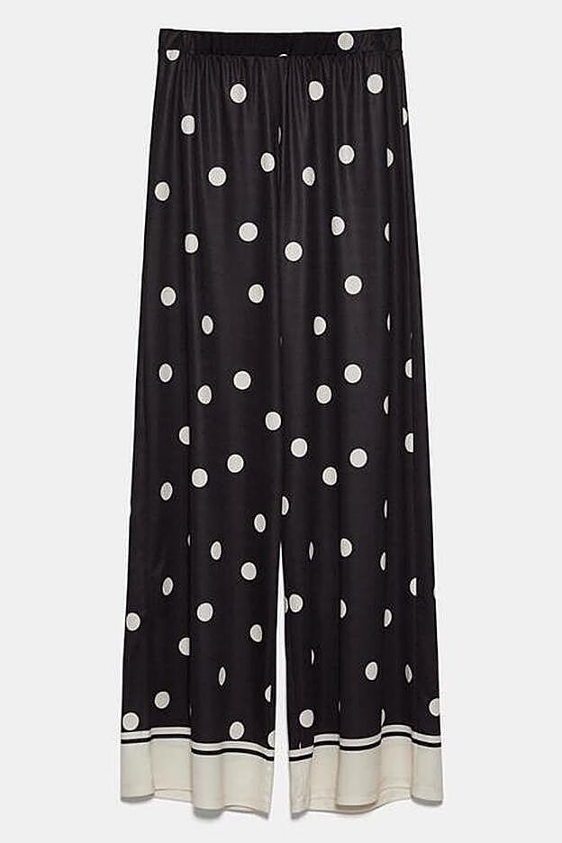 El pantalón es un modelo palazzo de lunares blancos sobre fondo negro y con el bajo con una ancha franja blanca. Un diseño de talle alto, fluido y de cintura elástica que está disponible en la talla S, M, L y XL y que puedes comprar por tan solo 17,95 euros.