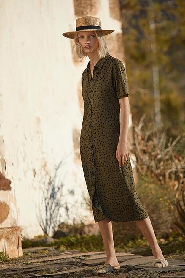 Se trata de un vestido de largo midi de estilo camisero por su cierre con botones y su cuello con salapas de manga corta. Tiene el diseño recto, que tú misma puedes mejorar añadiendo un cinturón para marcar la cintura, y un estampado que es completamente tendencia: los lunares. Con puntos negros sobre un fondo verde caqui, es un vestido muy fácil de combinar y muy versátil para la época veraniega.