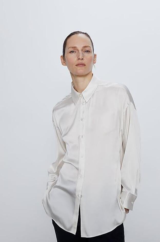 Tanto la blusa como la cazadora pertenecen al catálogo de Zara y todavía están disponibles en todas las tallas. La blusa, fluida de cuello con solapa y manga larga, tiene el bajo asimétrico y el cierre delantero con botones forrados. Cuesta 22,95 euros y ha llegado al catálogo de la firma entre las tallas XS y XL.