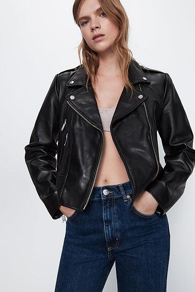 La cazadora biker, un clásico de cualquier armario, es de piel, tiene el cuello de solapa y bolsillos delanteros con cremallera metálica. Con detalle de trabillas en los hombros, cuesta 89,95 euros y está disponible entre las tallas XS y XXL.