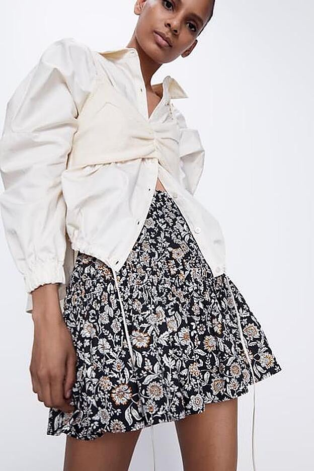 Se trata de una falda en color negro con flores en tonos beige que cuesta 22,95 euros y tiene el bajo acabado en volantes. Un diseño monísimo que nos ha encantado por el efecto estilizador gracias a los frunces. Tiene la cintura elástica y de talle alto, por lo que se adapta a la perfección a cualquier tipo de silueta y además viene con unos frunces que disimulan las curvas y la tripa. ¡Acierto total!