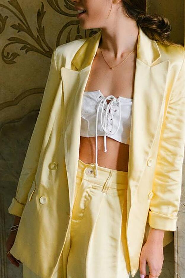 Se trata de un conjunto satinado formado por una blazer larga y fluida con cuello solapa, dos bolsillos delanteros y cierre cruzado con doble botonadura que cuesta 29,99 euros. Una prenda que tiene sus pantalones a juego, un modelo wide leg con cintura elástica que puedes comprar por 25,99 euros y que está completamente agotado en la web. La blazer ya solo está disponible en la talla S, pero visto el éxito, promete desaparecer en muy poco tiempo. Y no es para menos... ¿Quién dijo que amarillo da mala suerte? Nosotras ya nos hemos apuntado a la lista de espera, ¿y tú?