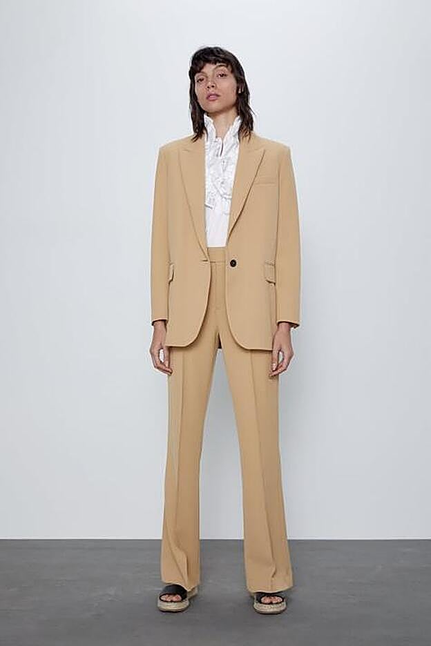 Para las más clásicas, la versión camel jamás pasa de moda, sobre todo si el pantalón es de tiro alto y recto. Un 'must' en cualquier armario que se precie. La blazer, de corte algo masculino y con hombreras, cuesta 39,99 euros y el pantalón, 19,99 euros.
