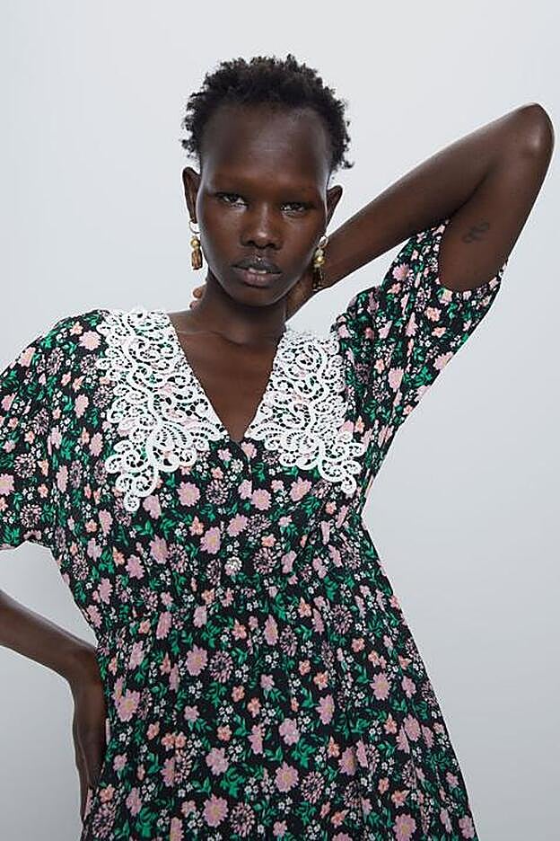 El vestido pertenece a la última colección de Zara, tiene escote de pico y bajo el mismo una aplicación guipur combinada a contraste en color blanco. Pertenece a la colección sostenible de Inditex y tiene la cintura elástica con cierre frontal con botones joya.