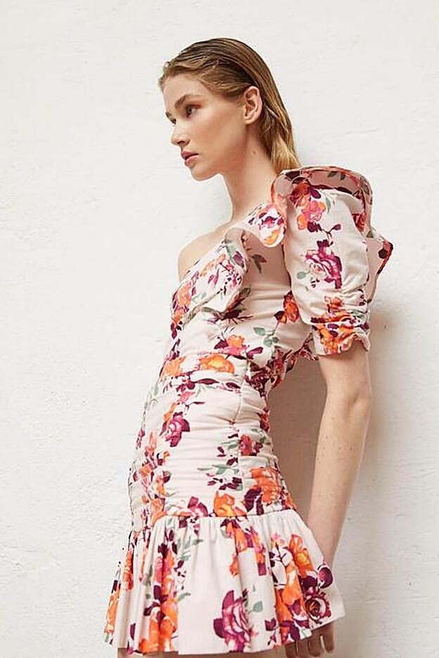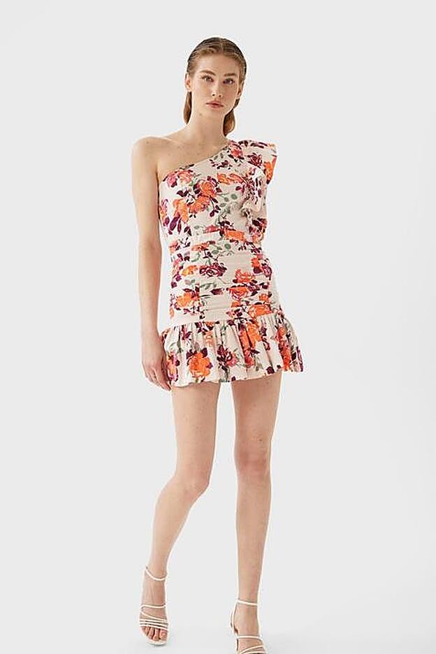 Un outfit formado por una mini falda de minifrunces (19,99 euros) que consigue una perfecta adaptación al cuerpo y un volante en el bajo y un top asimétrico con un hombro al descubierto y manga con volante. Ambas prendas con un estampado floral en tonos naranjas y granates muy favorecedor.
