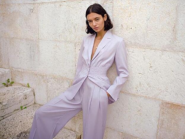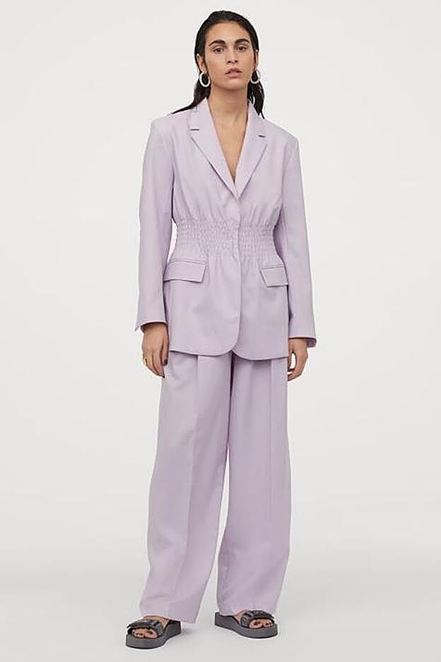 Se trata de un traje en color lila, sin duda el que tono que reina en las colecciones de primavera/verano y que se ha convertido en la apuesta segura si quieres triunfar en esta temporada. Un traje formado por un pantalón de pinzas palazzo y talle alto y una blazer larga. Sin embargo, es la chaqueta la que consigue ese efecto estilizador gracias a que no es cruzada ni tiene cierre de botones, si no que tiene una cintura ancha fruncida. Una característica que consigue que la prenda quede ceñida a la cintura afinándola.