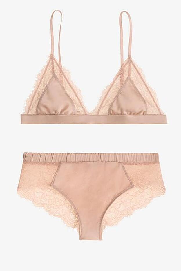 Tanto si eres de las que se ha enamorado de esta colección, como si no, es necesario que fiches el conjunto lencero que han traído. Zara se ha propuesto arrasar también con el mundo de la ropa interior y lo ha conseguido con su primera prenda. Se trata de un top de escote triangular en tejido satinado combinado con encaje, sin relleno, sin aro y con tirantes ajustables. Un modelo muy delicado que tiene su braguita brasileña con cintura elástica a juego.