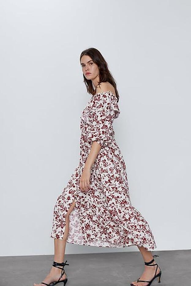 Se trata de un modelo en color beige con un estampado de flores pequeñas muy delicado, con un fruncido debajo del pecho, cierre de botones en el medio de la prenda y escote off shoulder. Un diseño que debe estar agotado en la web del gigante de Inditex ya que está completamente desaparecido. Aunque si como nosotras te has enamorado de él, hay disponible uno casi idéntico, pero con las flores más marcadas y en tonos grante. Cuesta 39,95 euros y tiene un diseño igual de ideal. ¡Lo queremos!