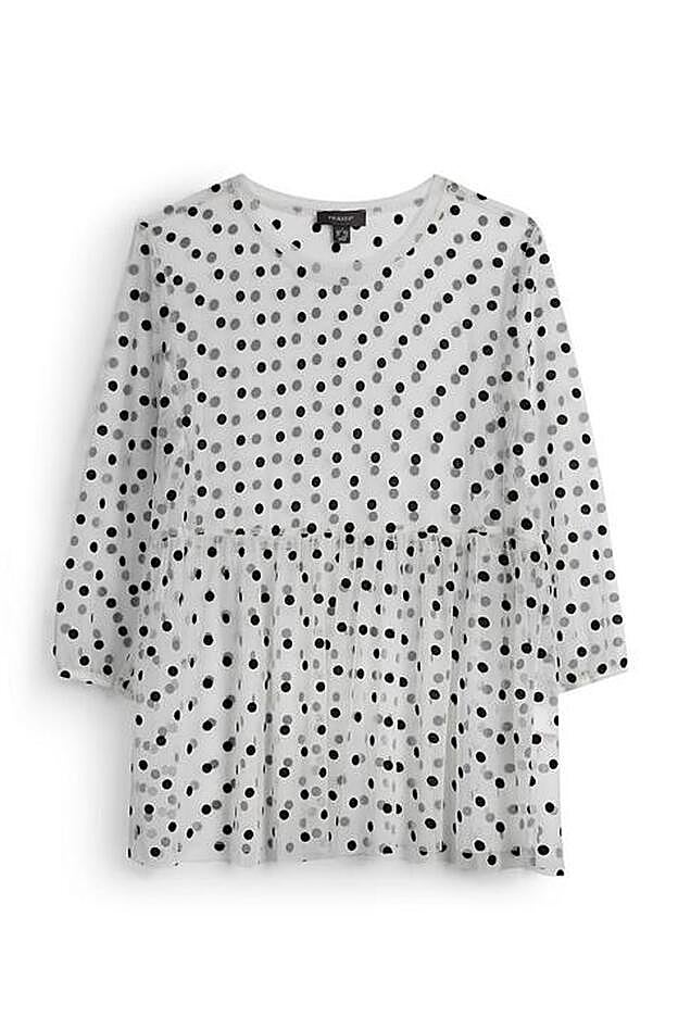 Por eso, cuando vimos este top de lunares blanco y negro, transparente, de manga francesa y con cuello redondo de Primark, pensamos ipsofacto: lo necesitamos.