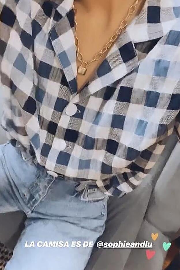 ¿Dónde conseguir la camisa de María Pombo? Se trata de una prenda en tonos azules con cuello solapa y manga corta de la firma española Sophie and Lucie.