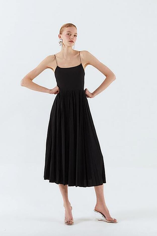 Para las aficionadas a las faldas plisadas hemos encontrado en Sfera este vestido midi de tirantes finos con falda plisada y escote recto. Cuesta 35,99 euros y solo queda en la talla L.